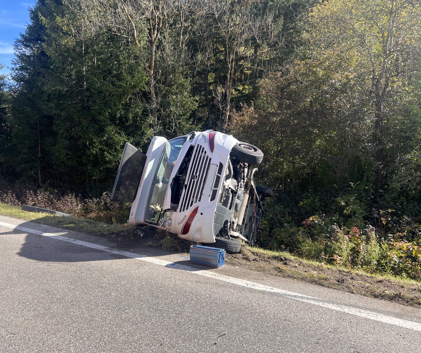 Ein Pkw war aus unbekannter Ursache auf die Gegenfahrbahn geraten und frontal mit einem entgegenkommenden Wohnmobil kollidiert. Der Pkw wurde in eine Wiese geschleudert, das Wohnmobil kippte auf die Seite.