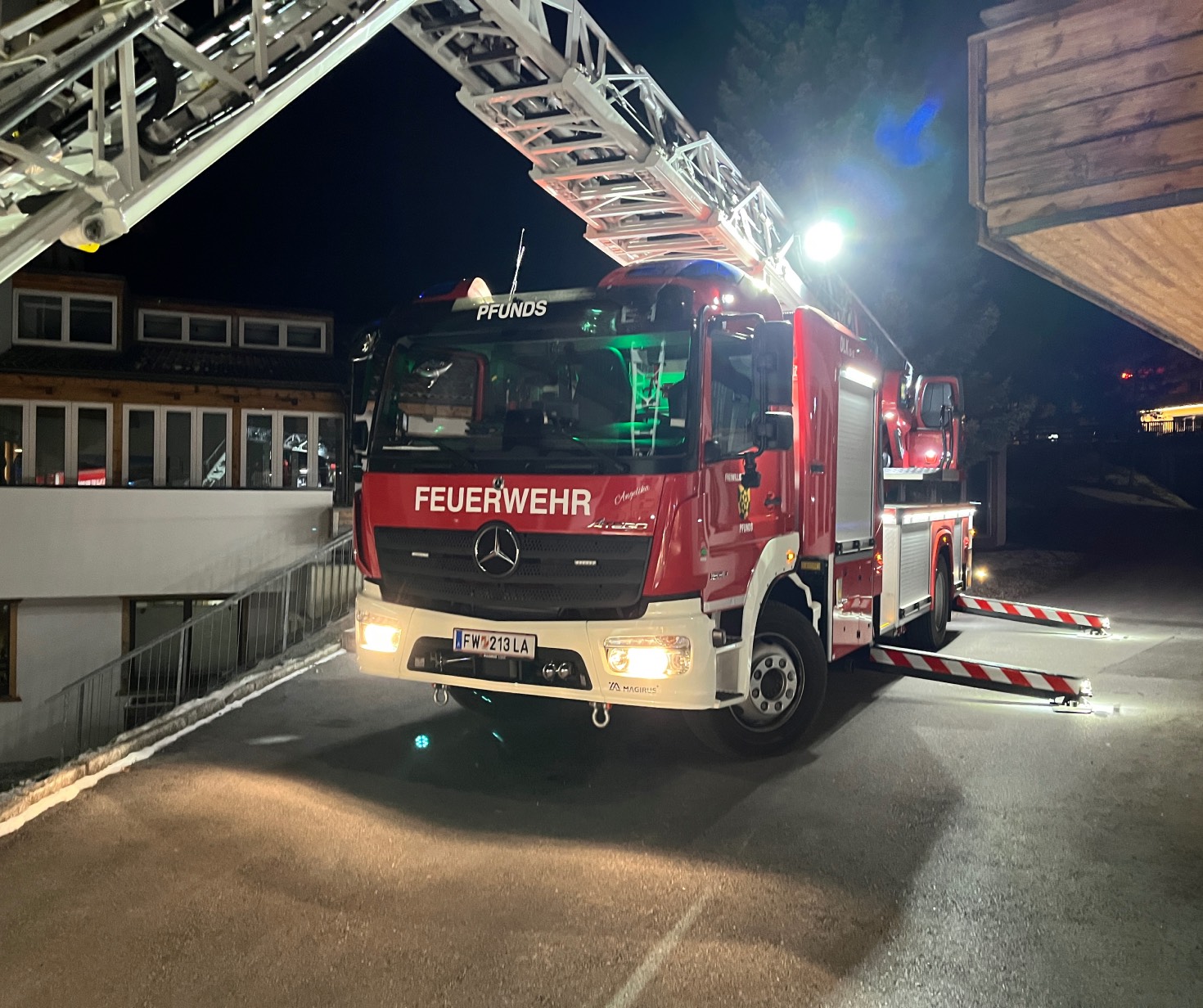 Am 21.11.2025 führte die Feuerwehr Pfunds eine Einsatzübung zum Szenario „BMA – Auslösung im Dachgeschoss, mehrere Personen vermisst“ durch. Insgesamt 39 Mitglieder rückten mit MTFA, LAST, KLFA, LFA-B, TLF und der DLK aus.